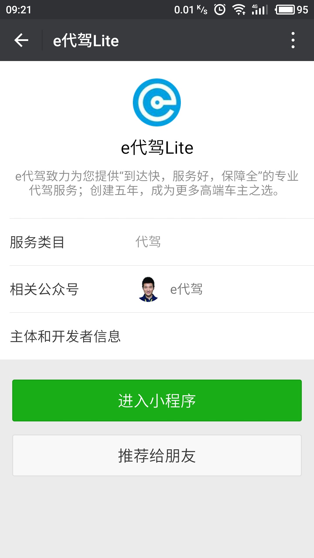 e代驾Lite微信小程序,帮助你快速找到附近的代驾司机,是开车外出酒局必备工具。添加e代驾Lite小程序,分分钟就能召唤出附近的代驾司机哦! 代驾小程序内容: e代驾Lite致力于为您提供“到达快,服务好,保障全”的专业代驾服务;创建五年,成为更多高端车主之选。