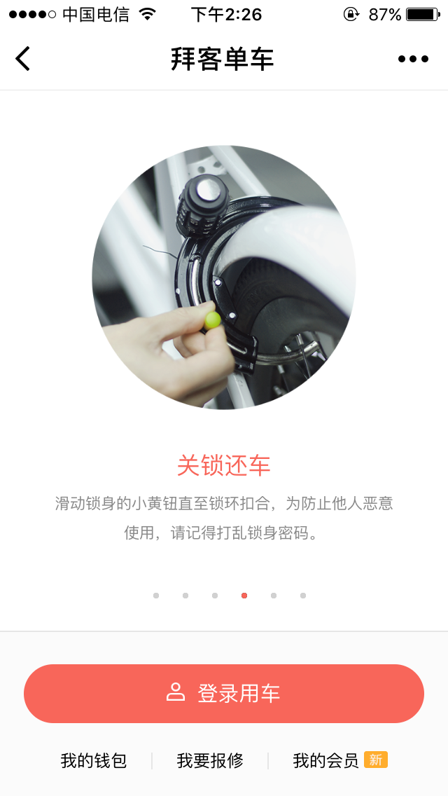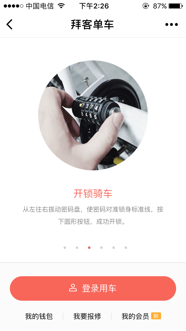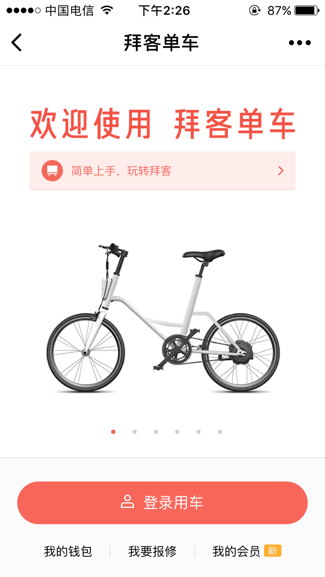 拜客单车小程序,为出行增添更多的方便。使用拜客单车小程序,使用微信扫码即可进入应用,打开相应的拜客单车,快速解锁后即可上路前行。 拜客单车小程序简介: 拜客与微信小程序紧密合作,推出行业领先的微信小程序,您只需打开微信扫一扫即可自动解锁。 随心随意,biker 相随。 扫码骑车,无需车桩,路边白线内有序停车――出行就是这样简单。