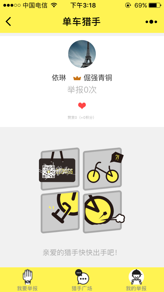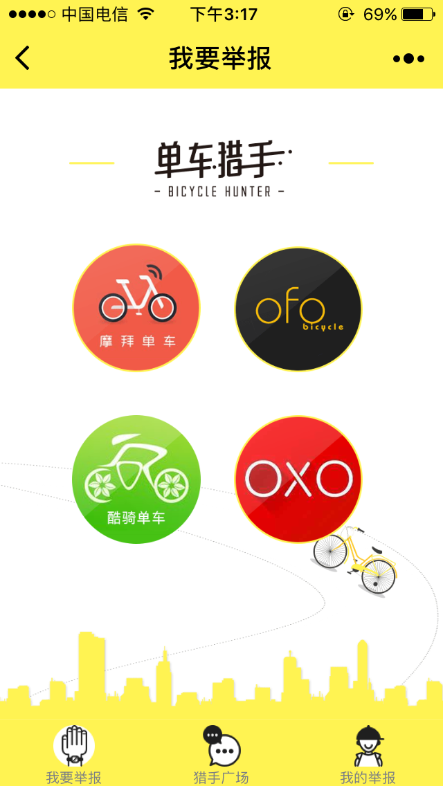 单车猎手微信小程序,是为共享单车打造的一个举报平台,对于摩拜单车、ofo共享单车、酷骑单车、oxo单车等品牌有什么想法,大家皆可在此反馈。 单车猎手小程序内容: 单车猎手是一个在线共享单车违停举报微社区,由大秦网开发,旨在为热心公益的单车猎人,提供交流、举报的平台