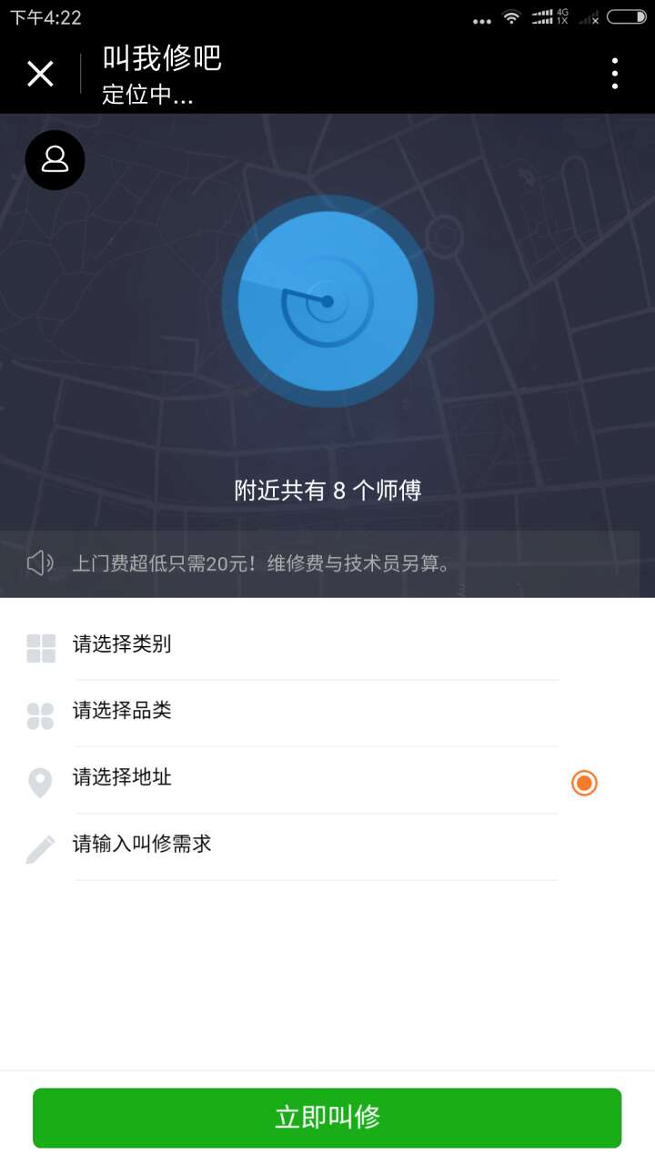 叫我修吧微信小程序―- 是一款为用户提供上门维修的小程序应用,叫我修吧小程序能为用户提供最便捷的上门维修服务,修电脑、修打印机只用叫我修吧。 叫我修吧小程序特色: 修电脑、修打印机只用叫我修吧,2小时必达,98%好评,10万多名技术员在全国1000多个城市为您服务! 叫我修吧小程序的使用需要获取用户的手机定位服务功能,这样才可以为用户提供附近是否有师傅的服务。叫我修吧小程序进入之后可直接输入你的维修需求,点击立即叫修及可完成服务。 叫我修吧小程序左上角的头像按钮可点击来绑定手机。