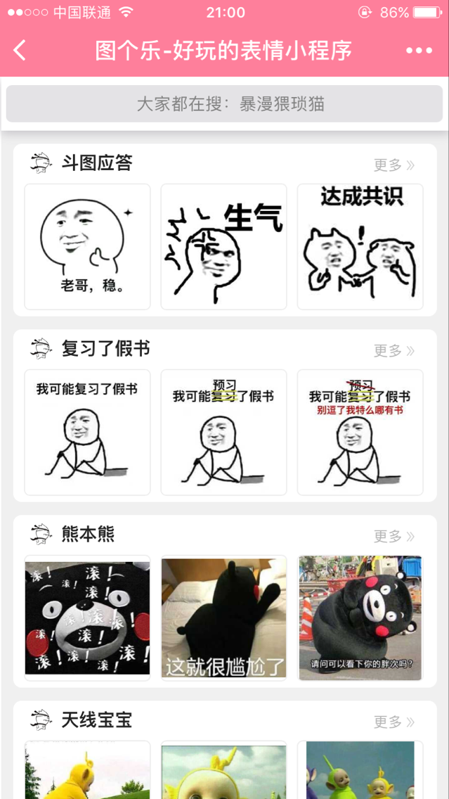 图个乐表情微信小程序---斗图必备!暴漫卡通动画明星表情,微信、QQ聊天斗图,再也不用担心没图图了,不管是什么表情保准给你斗到底!