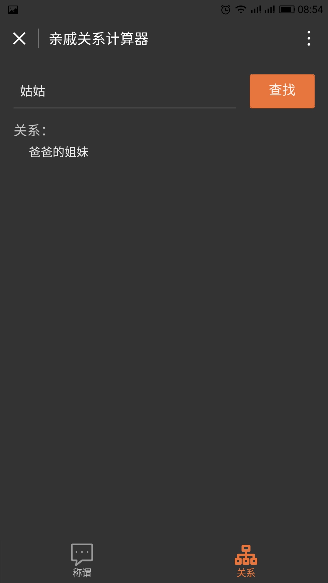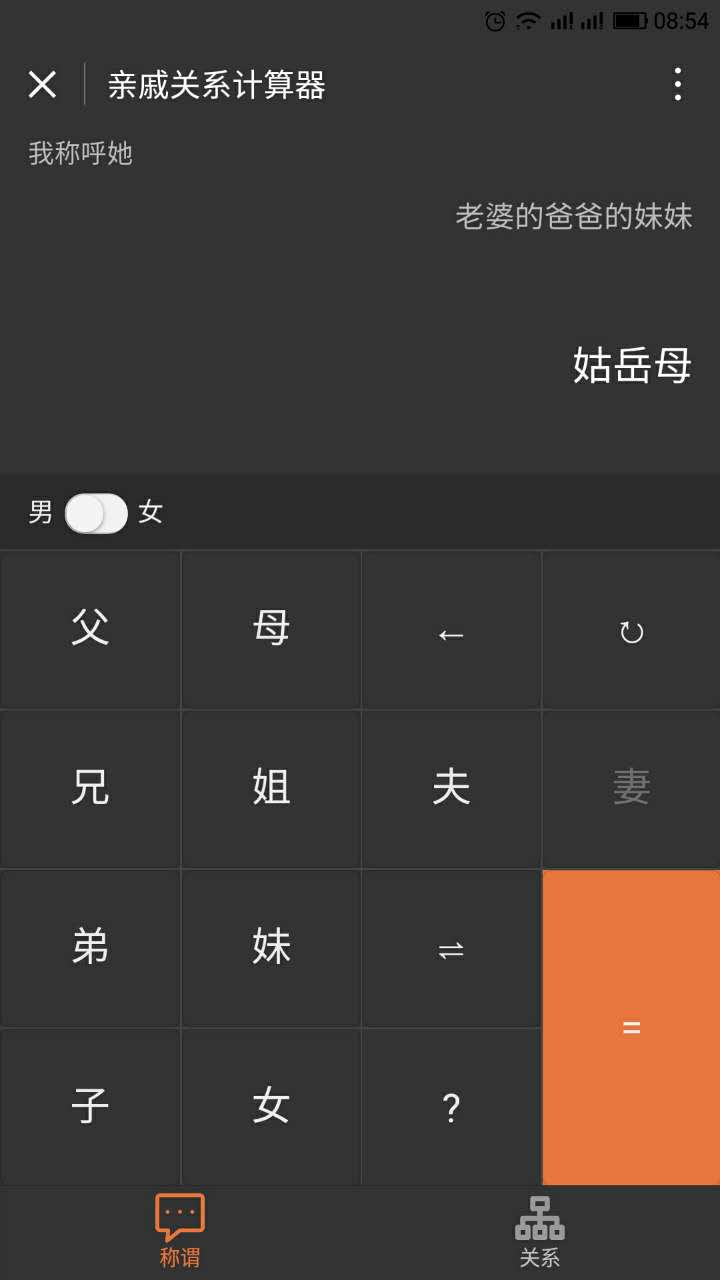 亲戚关系微信小程序----走亲戚时,你记得你爷爷的大儿子的女儿叫什么吗?亲戚关系小程序帮助你理清亲戚关系,麻麻再也不担心我喊错亲戚。 亲戚关系计算器小程序特色内容: 爸爸的妈妈叫什么? 这个大家估计很快就能反应过来, 但是“爸爸的妈妈的爸爸的哥哥的儿子的老婆”叫什么呢? 这个…… 许多远房亲戚都不认识,叫错人咋办? 大杀器出现了。亲戚关系计算器----只要输入那个人跟你的关系,就会计算出结果。