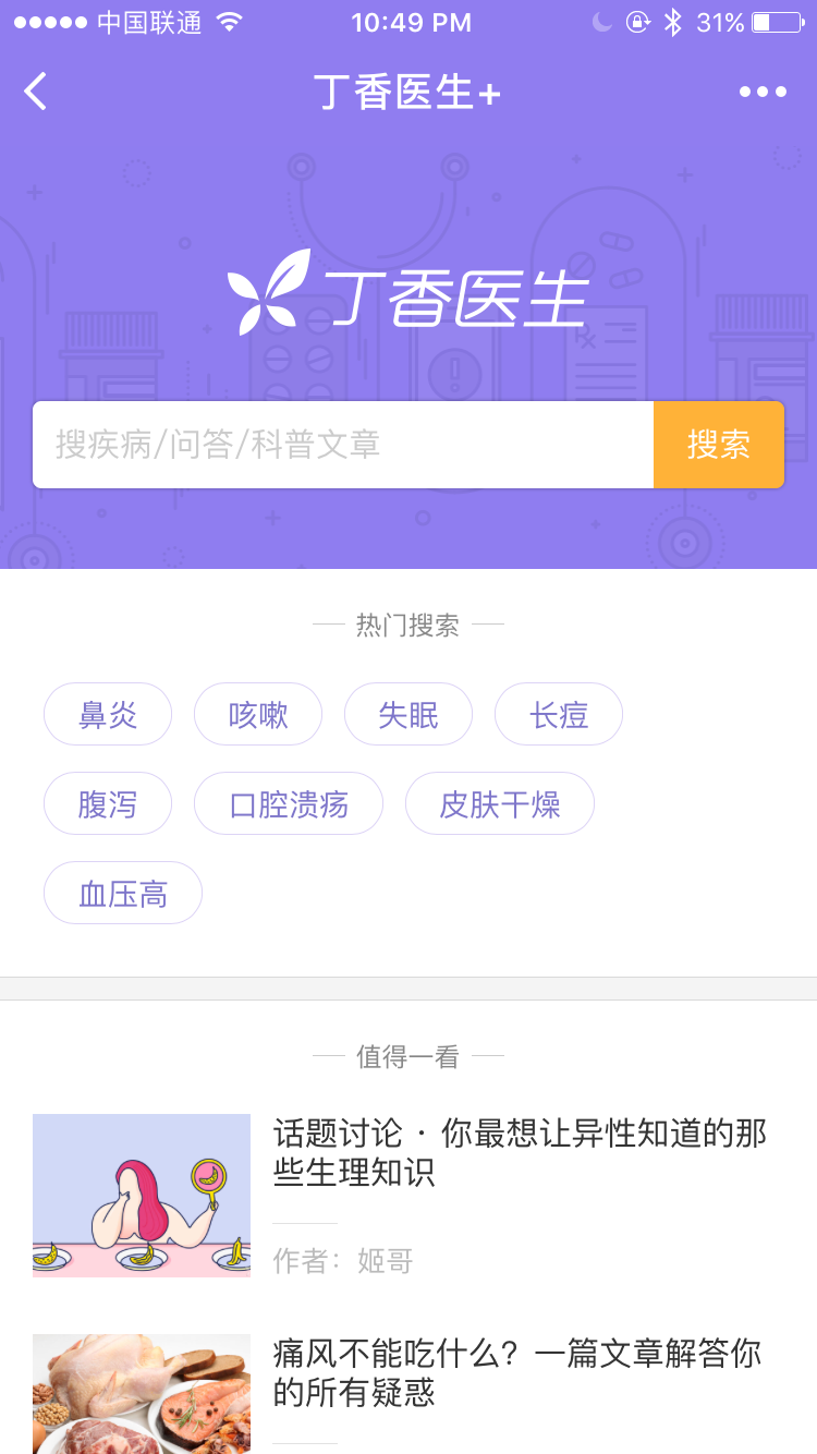 丁香医生+小程序带给你更加靠谱可信的健康知识,其医疗信息丰富,除了可搜索疾病、问题、科普文章外,还提供了热门搜索、值得一看栏目,帮助你更好的获取医疗健康信息。 小程序功能特色: 丁香医生小程序,搜索和发现可靠的医疗信息,远离朋友圈谣言。