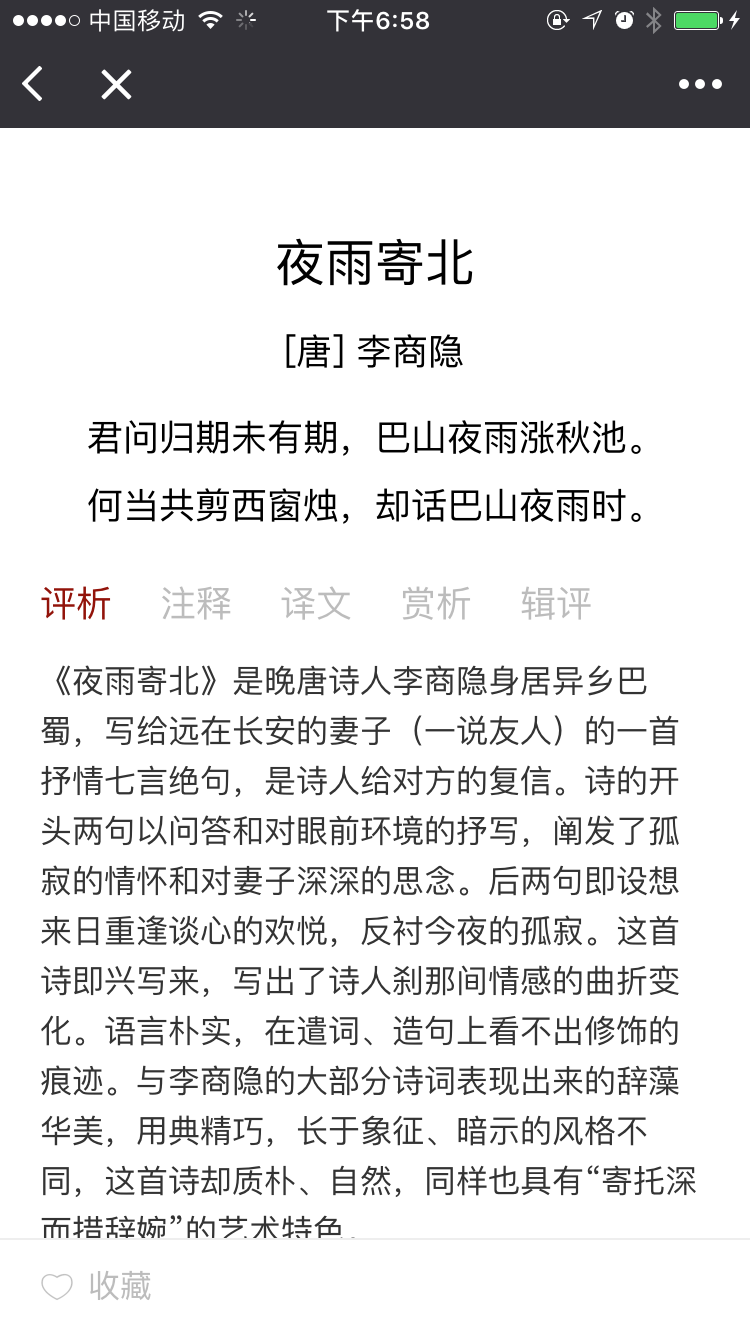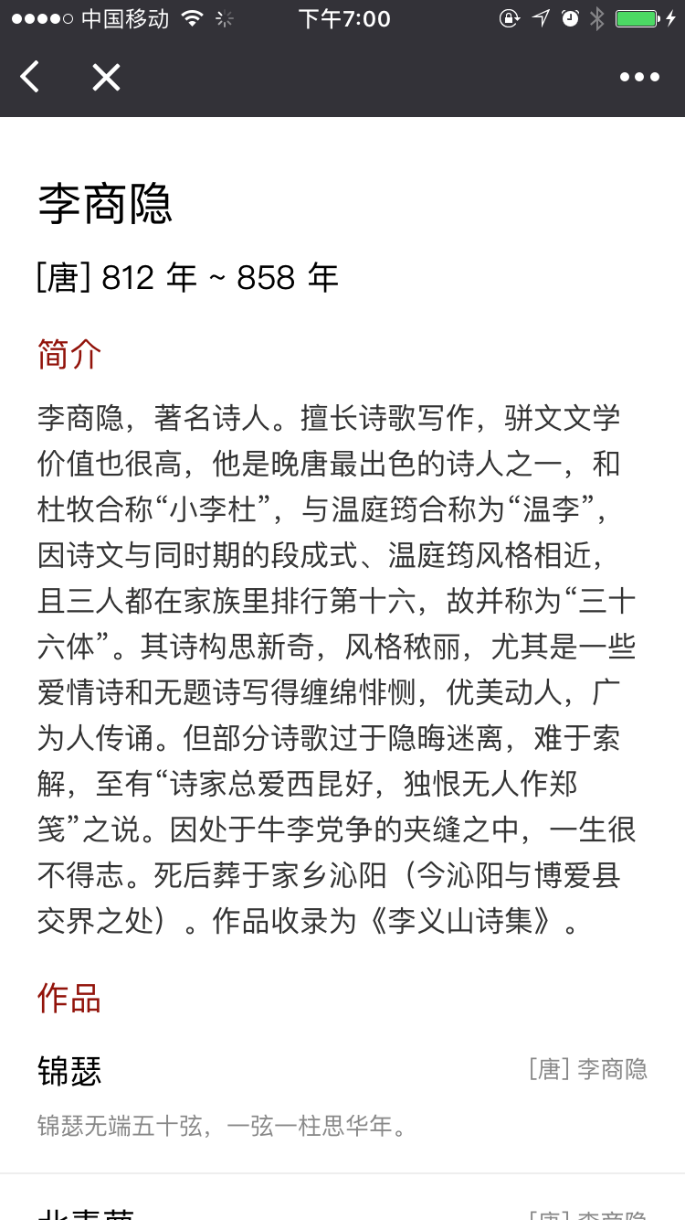 微信小程序西窗诗词,是由西窗烛app作者打造的诗词欣赏类小程序,提供了超多优美的唐诗宋词供大家免费阅读品味。 西窗诗词小程序内容: 品味唐诗宋词之美。 * 简约排版,干净优雅 * 50万首海量诗词歌赋 * 喜欢的诗,收藏一下 * 来听大家念诗!