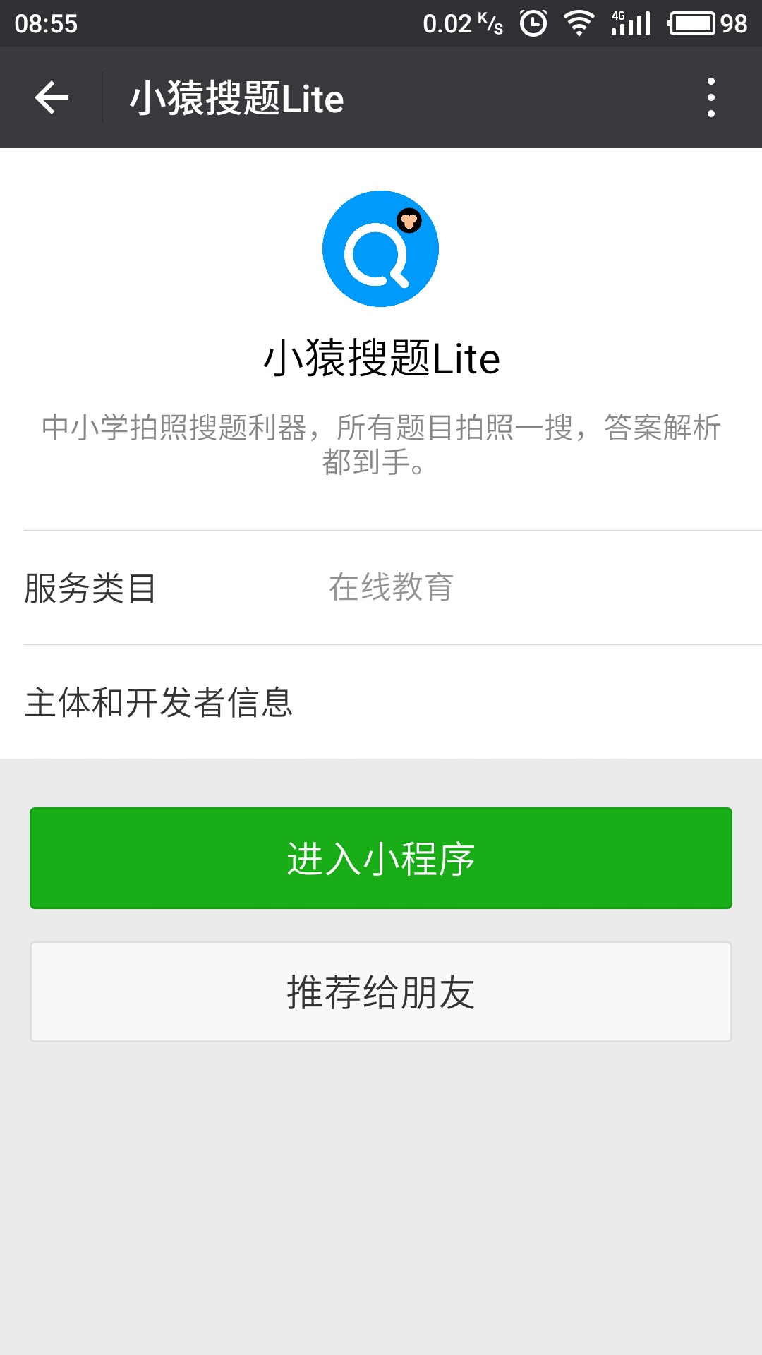 微信小程序-小猿搜题Lite,为各位中小学习带来最得力的作业小助手,帮助你快速搜题,找到该题的详细解析答案,帮助你边做作业边学习。 小猿搜题小程序内容说明: 中小学拍照搜题作业帮手。 所有题目拍照一搜,答案解析都到手。