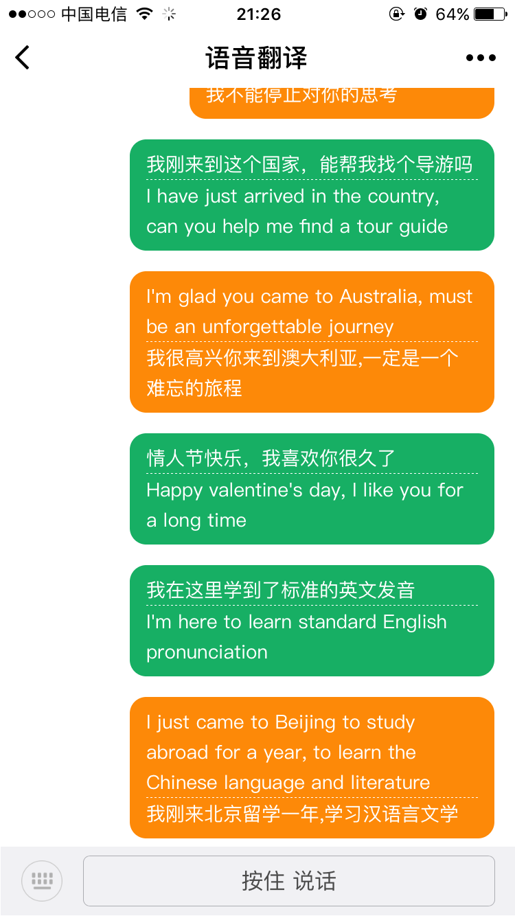 轻松同传微信小程序----翻译工具,此小程序让语言转化更方便、更好玩。是英文翻译、英文词典、有道词典、金山词霸等基础软件的升级产品。 小程序特色内容: 致力于人工智能的语音翻译服务,页面清新,操作简单,学学单词,听听听力,通过文字或者语音的方式直接翻译,且地道口语化,学习、出国旅游必备神器。