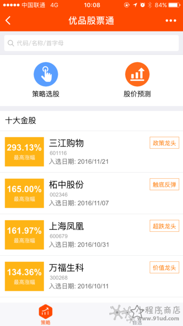 优品股票通这款微信小程序是一款炒股神器,它可以通过股票预测看未来,投资有风险,入市需谨慎,策略选股定乾坤。为股票交易者指明方向,让炒股的股民可以随时随地的得到有价值的情报消息,能够快速发现商机和规律,走向致富的道路。
