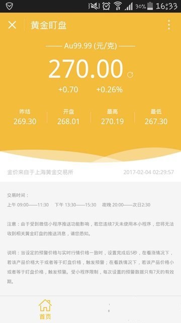 黄金盯盘微信小程序是为了给用户提供黄金报价与提醒,让用户随时随地就可以获取黄金的最新信息,辅助您生活、工作、娱乐等需要的软件,你可以设置一个预警价格,就是在实时价格波动值出现大幅度的波动的时候就会进行预警,这是一个非常贴心的小功能,了解黄金的实时行情,是黄金理财的好帮手。 黄金盯盘小程序作用: 1.交易更公平 全球价格同步 无庄家更透明 2.资金更安全 银行监管 存取款自由支配 3.操作更自由 双向操作 买涨买跌都有机会 4.时间更灵活 22小时交易 不