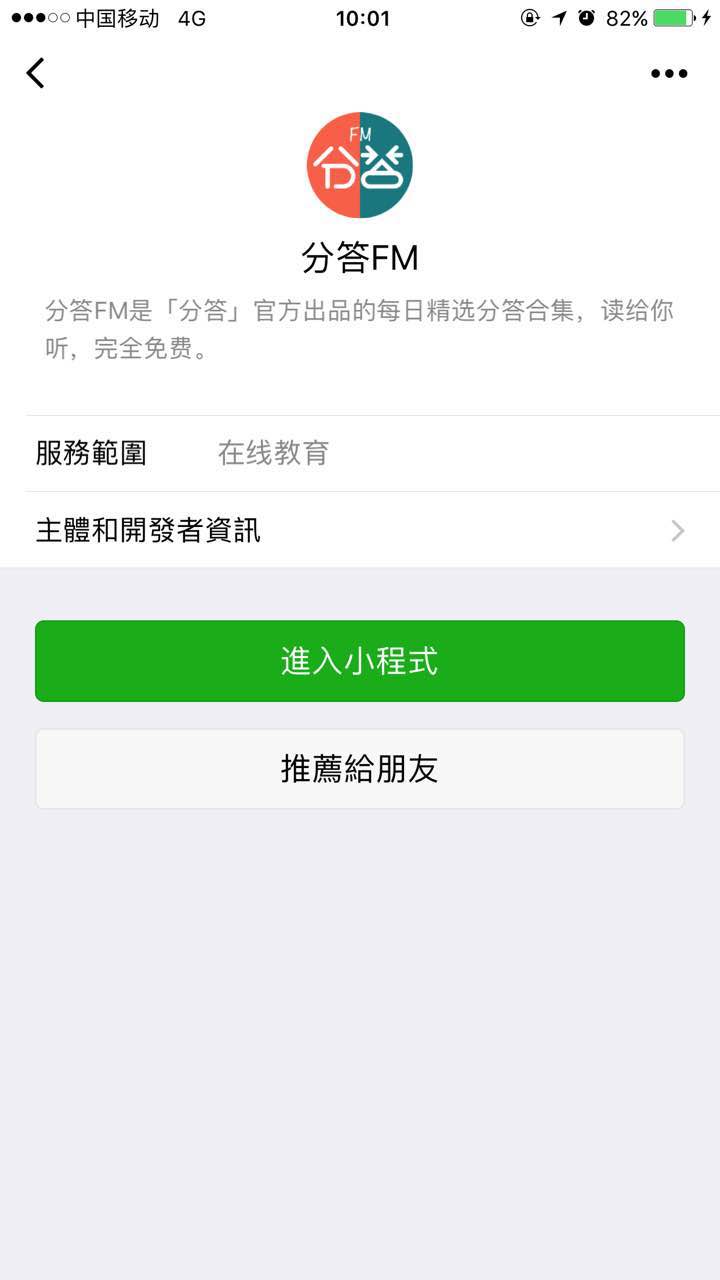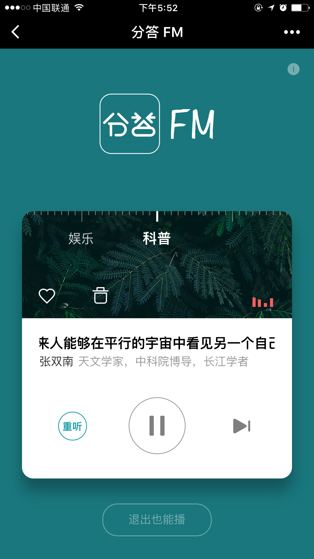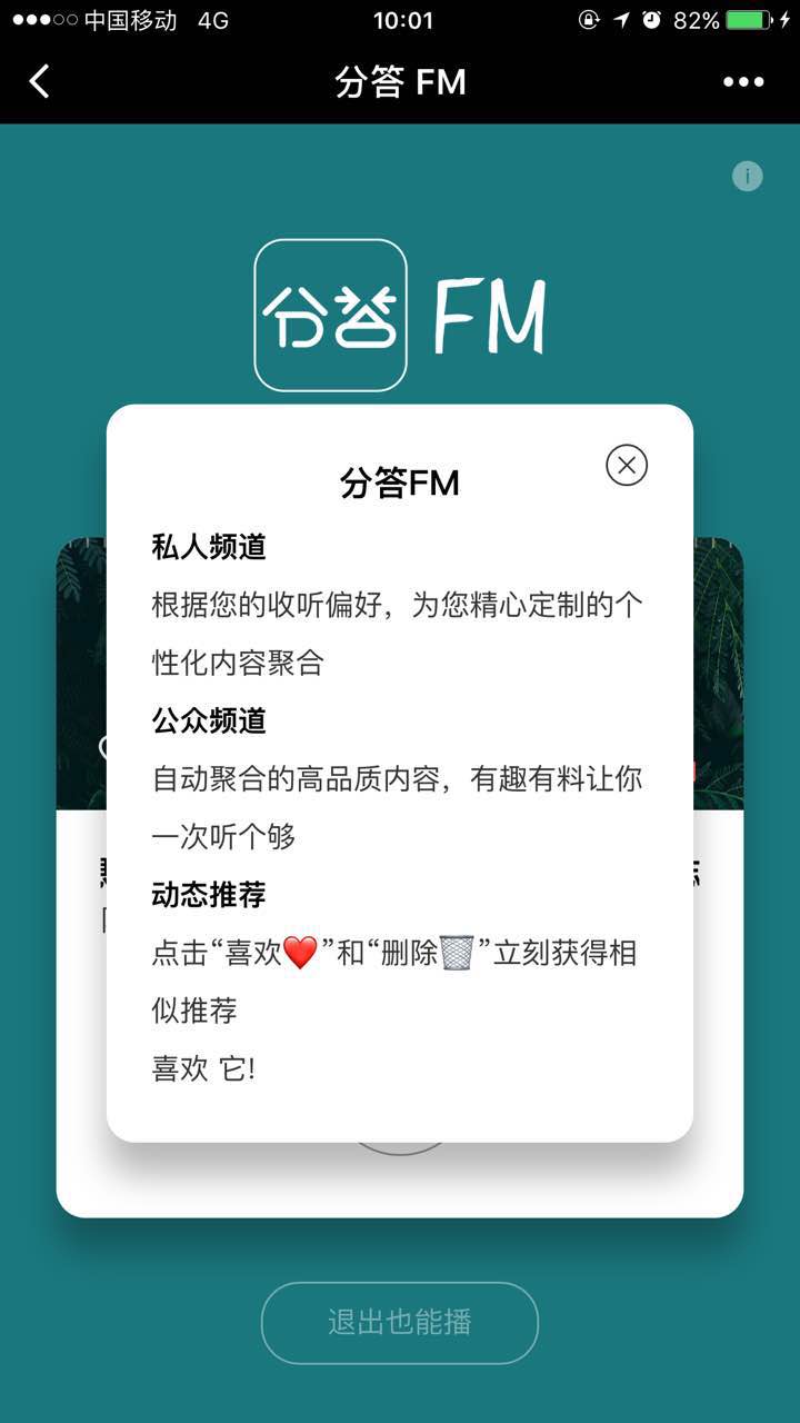分答FM小程序主要是方便用户随时随地都能听到广播,微信搜索退出页面也可以继续听广播,非常方便。喜欢的朋友快来腾牛网扫一扫吧! 分答FM介绍 分答FM是「分答」官方出品的每日精选分答合集,读给你听,完全免费。 分答FM作用: 私人频道 根据您的收听偏好,为您静心定制的个性化内容聚合 公众频道 自动聚合的高品质内容,有趣有料让你一次听个够 动态推荐 点击“喜欢”和“删除”立刻获得相似推荐。