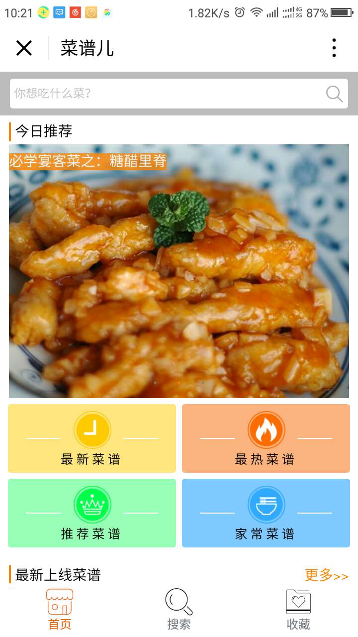 菜谱儿微信小程序----做菜小程序,查看海量美食菜谱,每篇菜谱都有详细的制作过程及文字说明,无需下载APP也能拥有做菜助手的完美体验! 菜谱儿小程序特色内容: 它提供最新最热的菜谱,以及最全的菜谱大全,菜谱儿,您身边的做菜助手。 使用这款小程序可以看到丰富的美食菜谱,页面简洁美观,详尽的美食制作过程,感觉我们离美食又进一步。 用最快的方法做最好吃的美食,快手到不行,简直信手拈来。