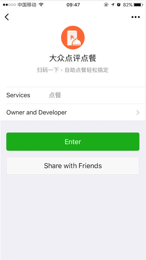 微信大众点评点餐小程序,是为餐饮行业制作的点餐服务程序。使用大众点评点餐小程序,能够在排队等候的时候就把菜单点了,就算是点过了菜单,还能信手拈来再点一遍。 大众点评点餐小程序介绍: 扫码一下,自助点餐轻松搞定。 小程序特色说明: 终于不用担心服务员听不懂我的普通「发」了。 在支持「大众点评点餐」的餐厅扫一扫二维码,即可通过手机自助点餐,省去等待服务员的烦恼。