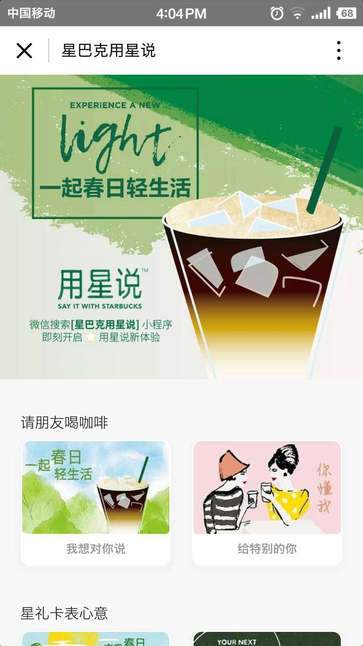 实际上现在出现在我们面前的小程序也几乎和之前一模一样,界面、操作、体验感受如出一辙,如果你之前已经用过“用星说”给朋友们买过咖啡或者星礼卡,那“用星说”的小程序只是入口不同而已。