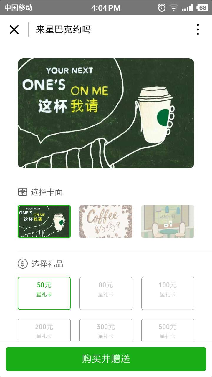 而剩下的就是我们已经习惯的赠送方式。星巴克可以以这样的方式不断换新卡片设计、祝语,或者在不同的节点带来不同的活动,方便用户以最简单、最不需要决策层本的方式传情达意。
