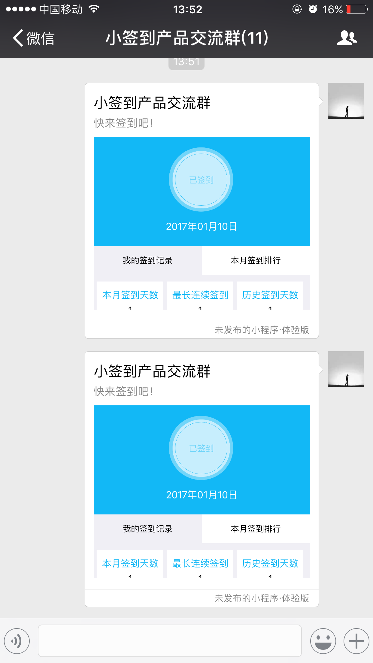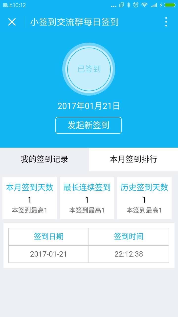 小签到微信小程序----专为小程序而生的微信群签到产品,签到常见于各种微信群,日常打卡或者主题培训活动签到,对于统计活动参与人数,促进用户活跃都有很大的帮助。 小签到小程序特色内容: 一款精致小巧的签到产品、用于活动签到打卡、微信群日常签到,比较实用,当然在大家同学聚会,或者是参加一些商务精英聚会,又或者是婚礼现场,都可以使用这个小签到小程序,更方便大家的签到,也不浪费时间。都可以来尝试一下哦!