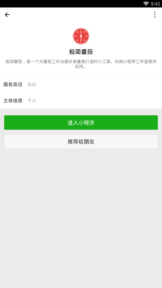 极简番茄小程序,有人称它为非常有性格的番茄闹钟,至于怎么有性格?就是它实在是极度简单,简单到只有一个按钮,没有工作时间的调节,也没有各类工作项目,只为番茄工作法爱好者量身打造。 极简番茄小程序官方内容: 极简番茄,是一个为番茄工作法爱好者量身打造的小工具。 风雨小程序工作室提供支持。