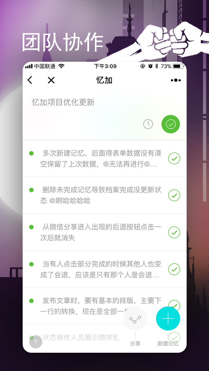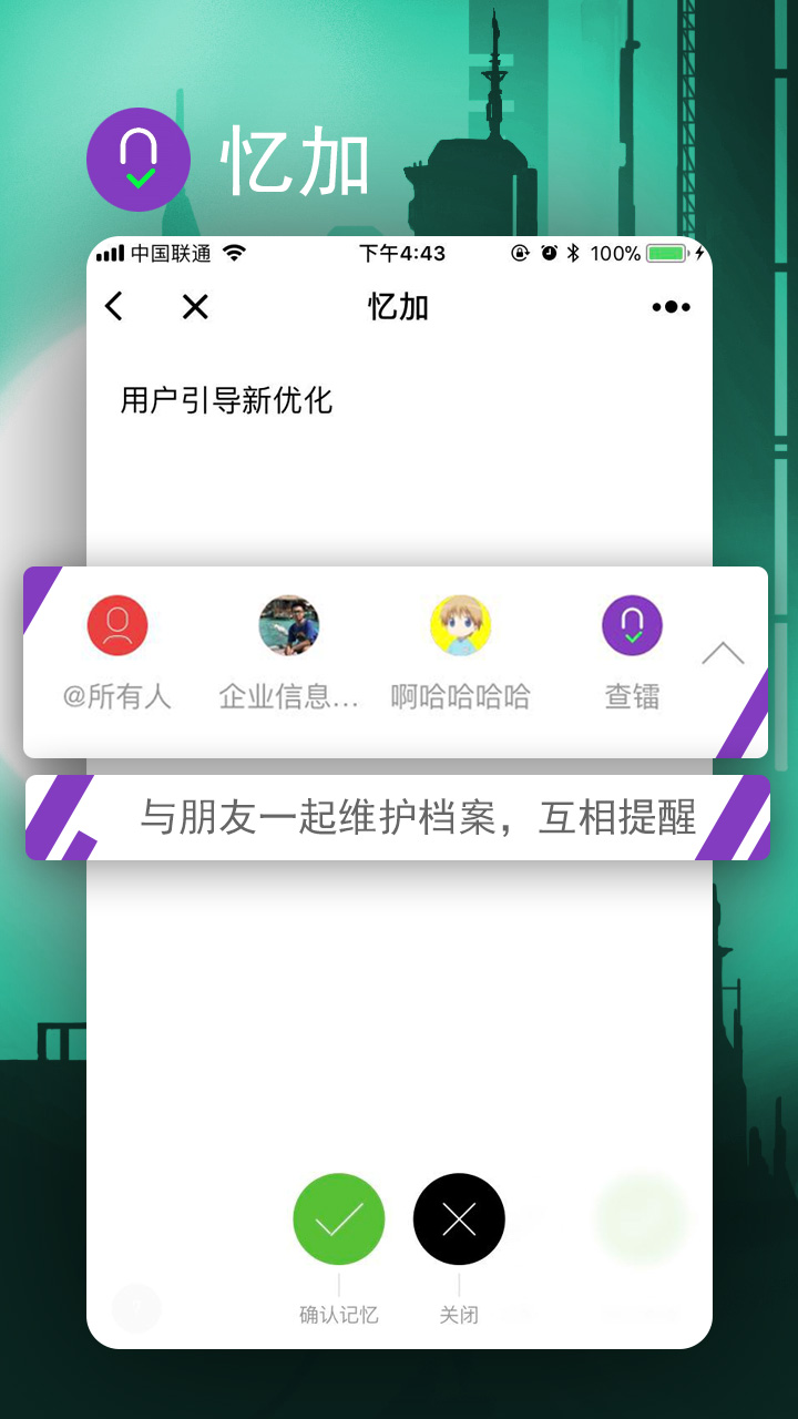 忆加是一款基于微信关系 帮助你和其他人共同记忆的小程序,你可以把记忆档案分享给一位朋友,一个微信群在这个记忆档案中,每个人都可以新增记忆,都可以更改已有记忆的状态;它可以作为一个群备忘录,也可以作为轻便好用的团队协作小程序。