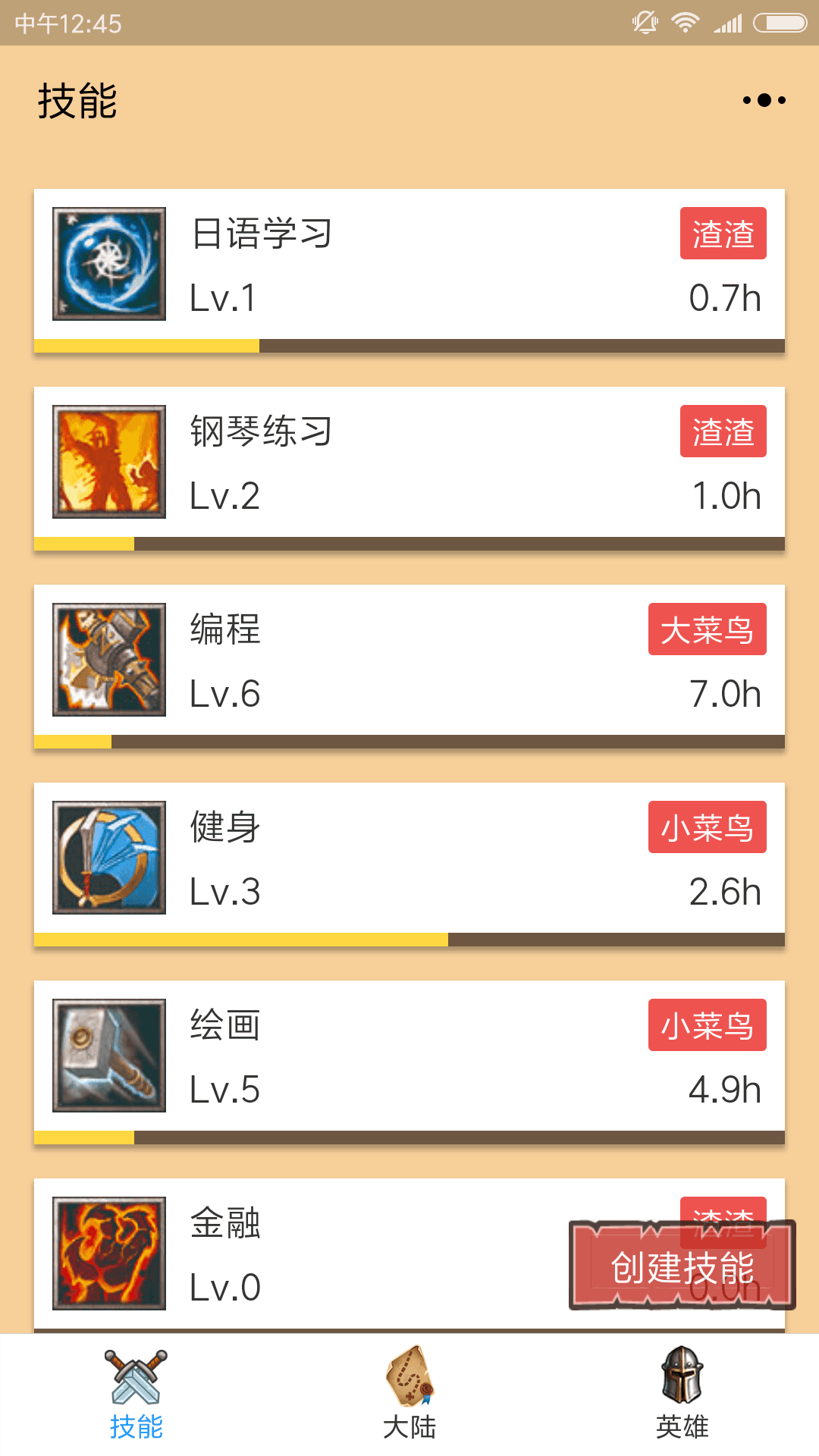 TimeHero微信小程序,是一款时间管理类小程序,大家可以根据自己的个人兴趣爱好,创建自己的技能,每在技能消费时一定的时间,就记录上去,可以达到升级的效果。