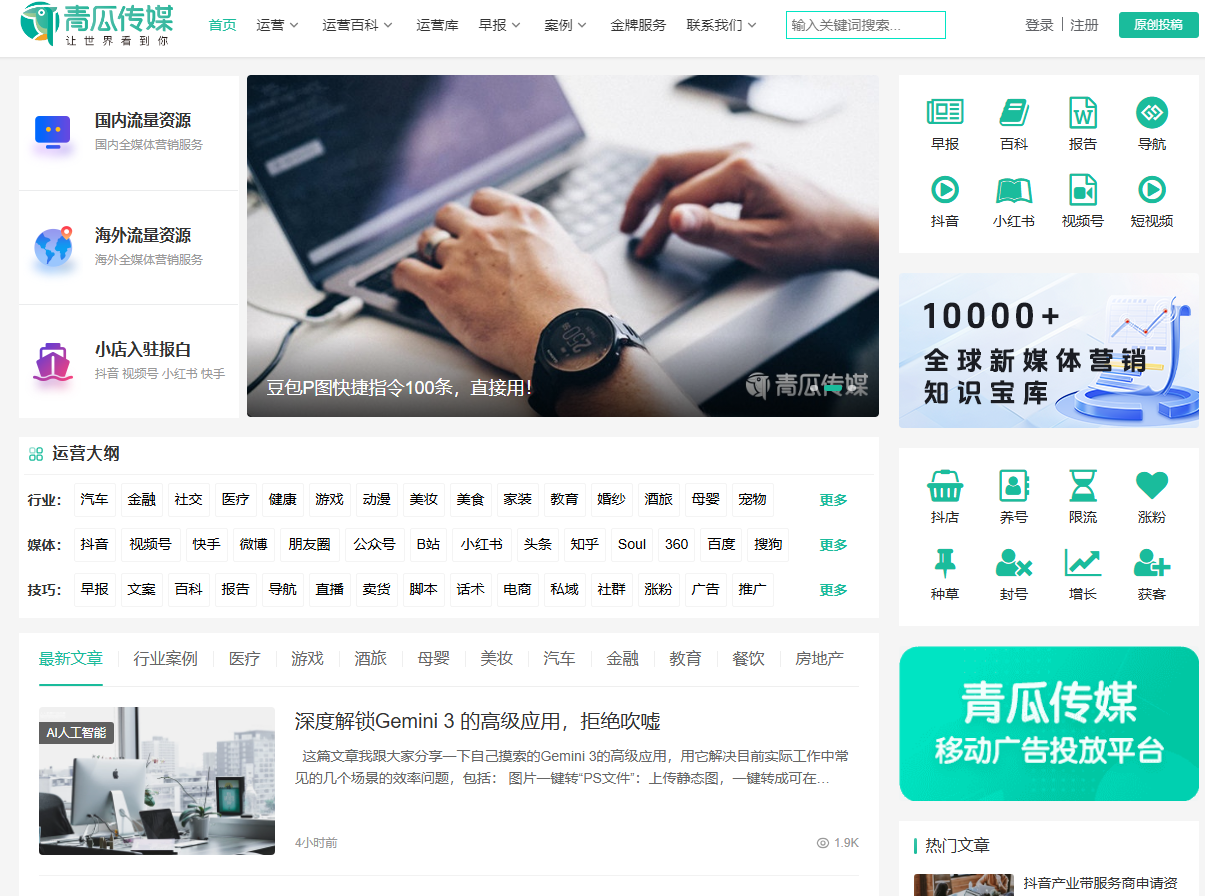 网站描述:「青瓜传媒」是全球数字营销运营推广学习平台!涵盖移动互联网运营,推广,营销,广告,文案,策划,新媒体,短视频等一系列文章干货,也包含APP推广,游戏推广,海外推广,抖音推广,快手推广,小红书推广,微信推广,产品运营,苹果竞价,ASO优化,品牌营销,文案策划,移动广告投放,信息流广告投放平台,积分墙平台,苹果ASM竞价排名广告投放平台!青瓜传媒是目前国内移动互联网运营推广干货最全面的学习平台!也是国内在运营推广营销领域最专业的推广平台,拥有15年运营推广经验!青瓜传媒是厦门青瓜信息科技有限公司旗下媒体平台,