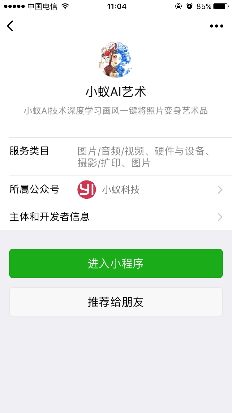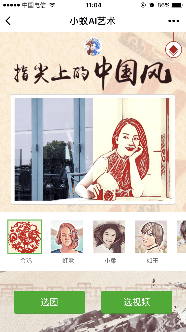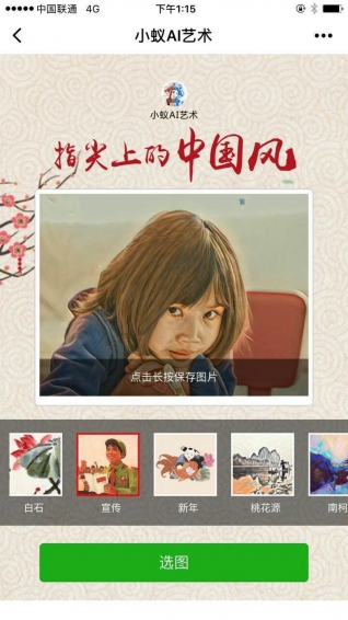 小蚁AI艺术微信小程序----是小蚁科技推出的一款通过人工智能实现“中国风”图像转化的工具,深度学习画风,一键将照片变身艺术品。 小程序特色内容: 小蚁AI艺术小程序用起来十分方便,页面简单,少了繁杂的推送广告,立马将照片变换各种风格。用人工智能掀起一场中国风的图像风潮!官网:www.xiaoyi.com 小编说: 超级好用,中国风味很浓,艺术与人工智能结合非常棒,效果太赞了,而且现在也开启了社区功能,不过谁能告诉我左下角的二维码水印怎么去掉!!