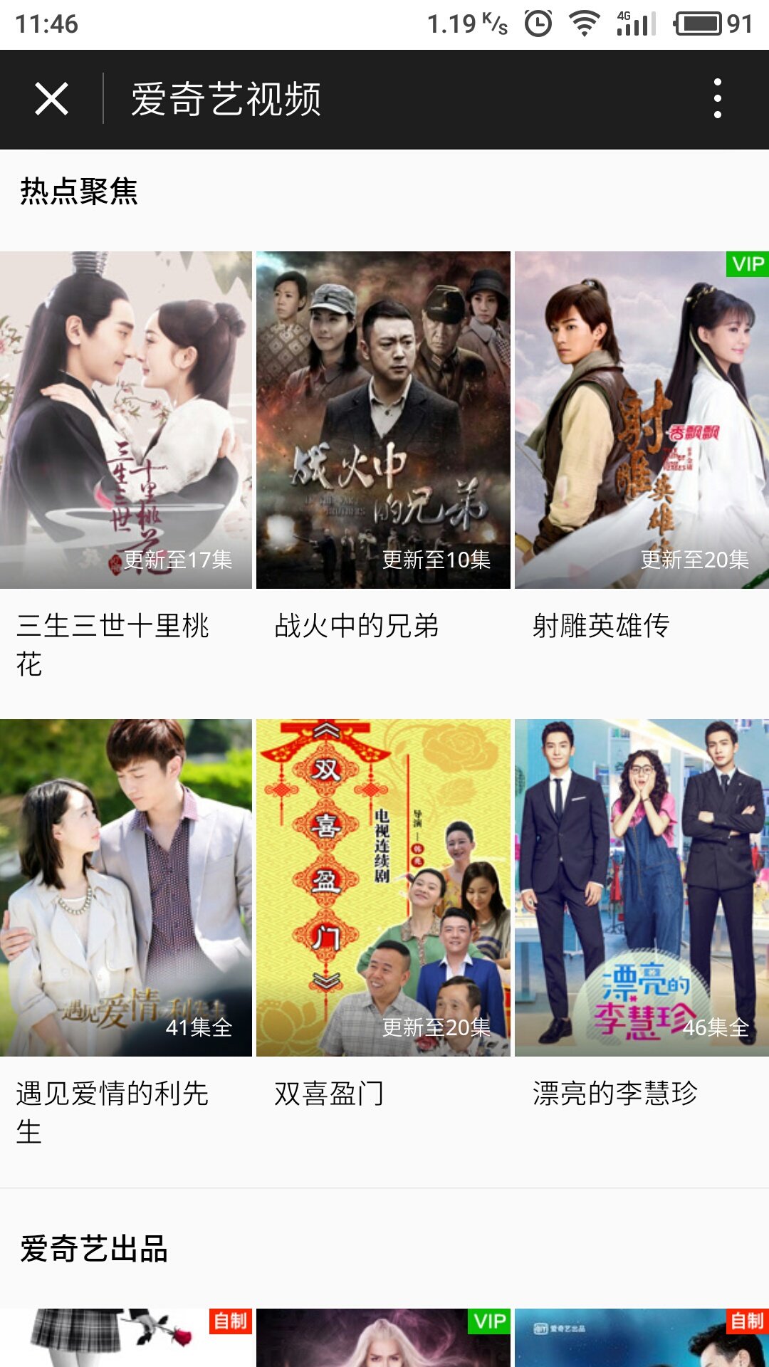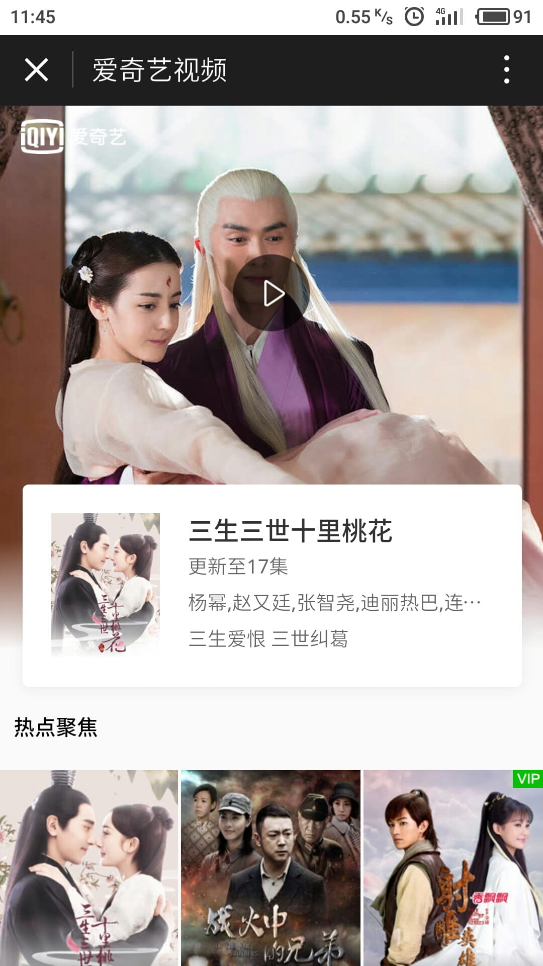 爱奇艺视频小程序,由爱奇艺公司打造。爱奇艺最新电视剧、电影、短片都会同步在此上线,遗憾的是爱奇艺视频小程序目前还未推出视频搜索功能,仅能靠在视频推荐和视频类别中找寻你想要的资源。 小程序视频类别: 热点聚焦、爱奇艺出品 网络剧精选、等你回家 养眼韩剧、古装言情